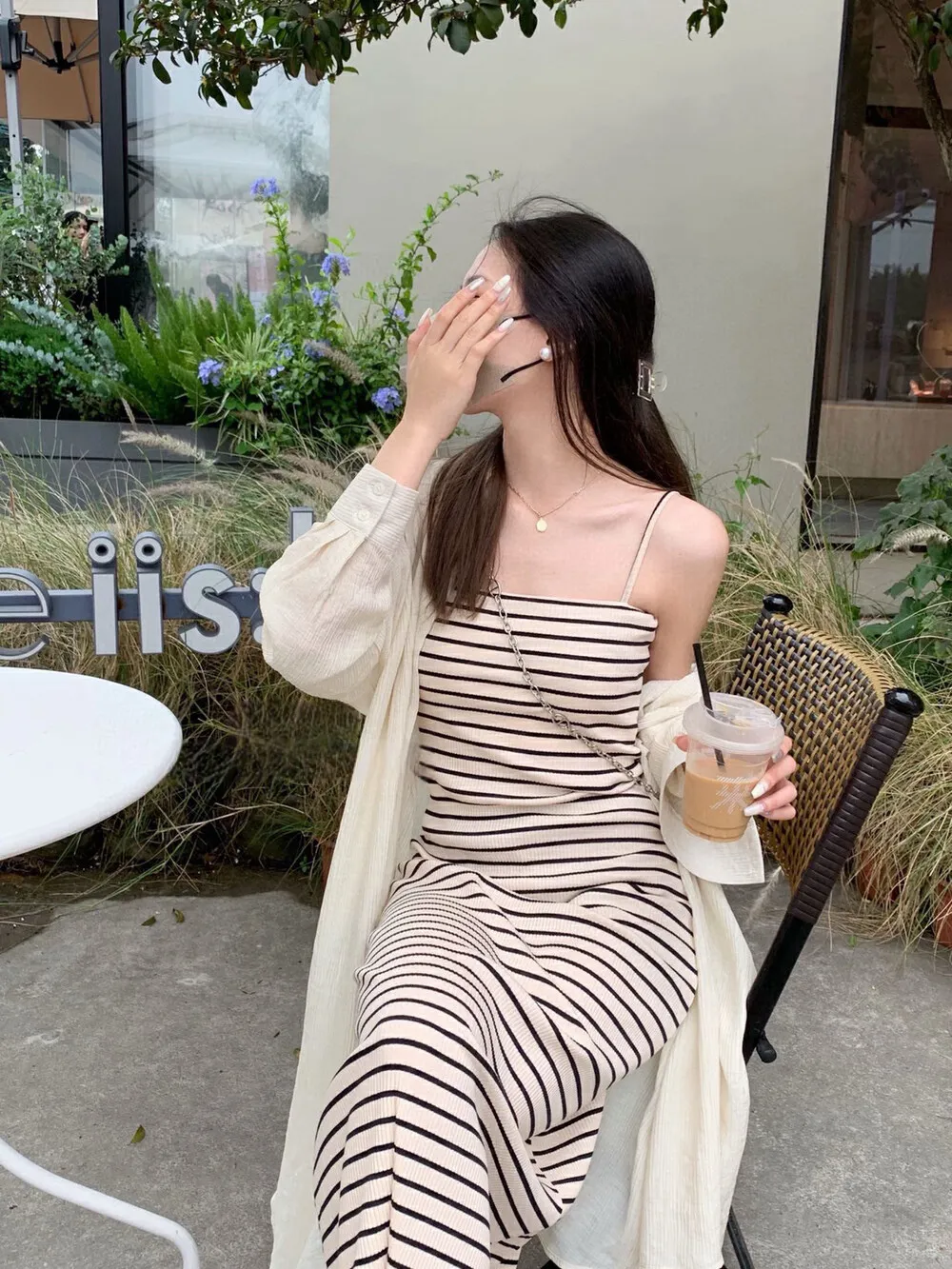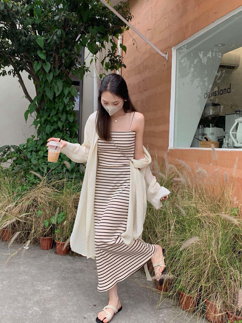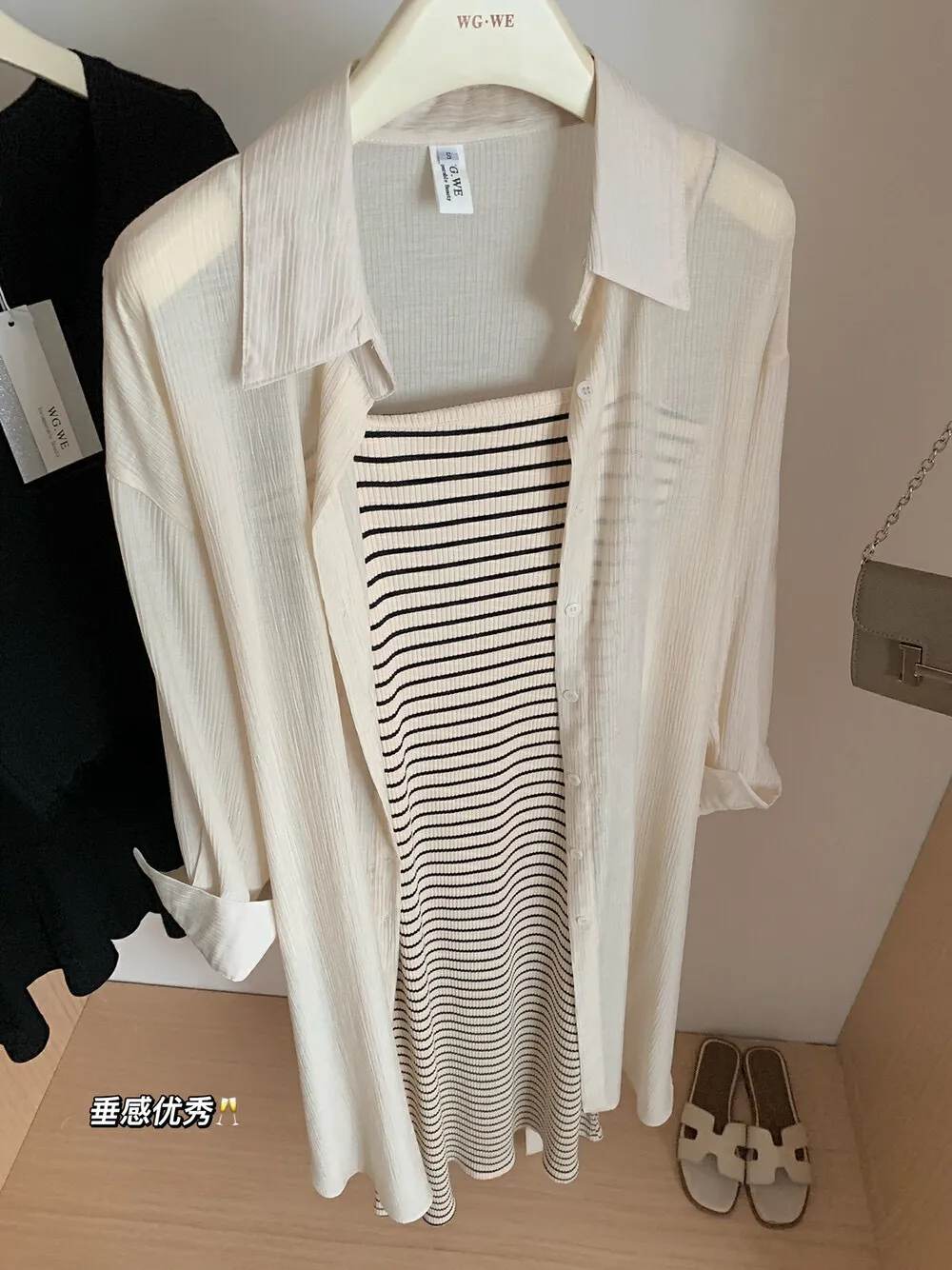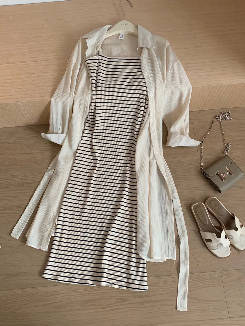气质条纹裙显瘦百搭一字肩休闲时髦长连衣裙+防晒衬衫两件套套装