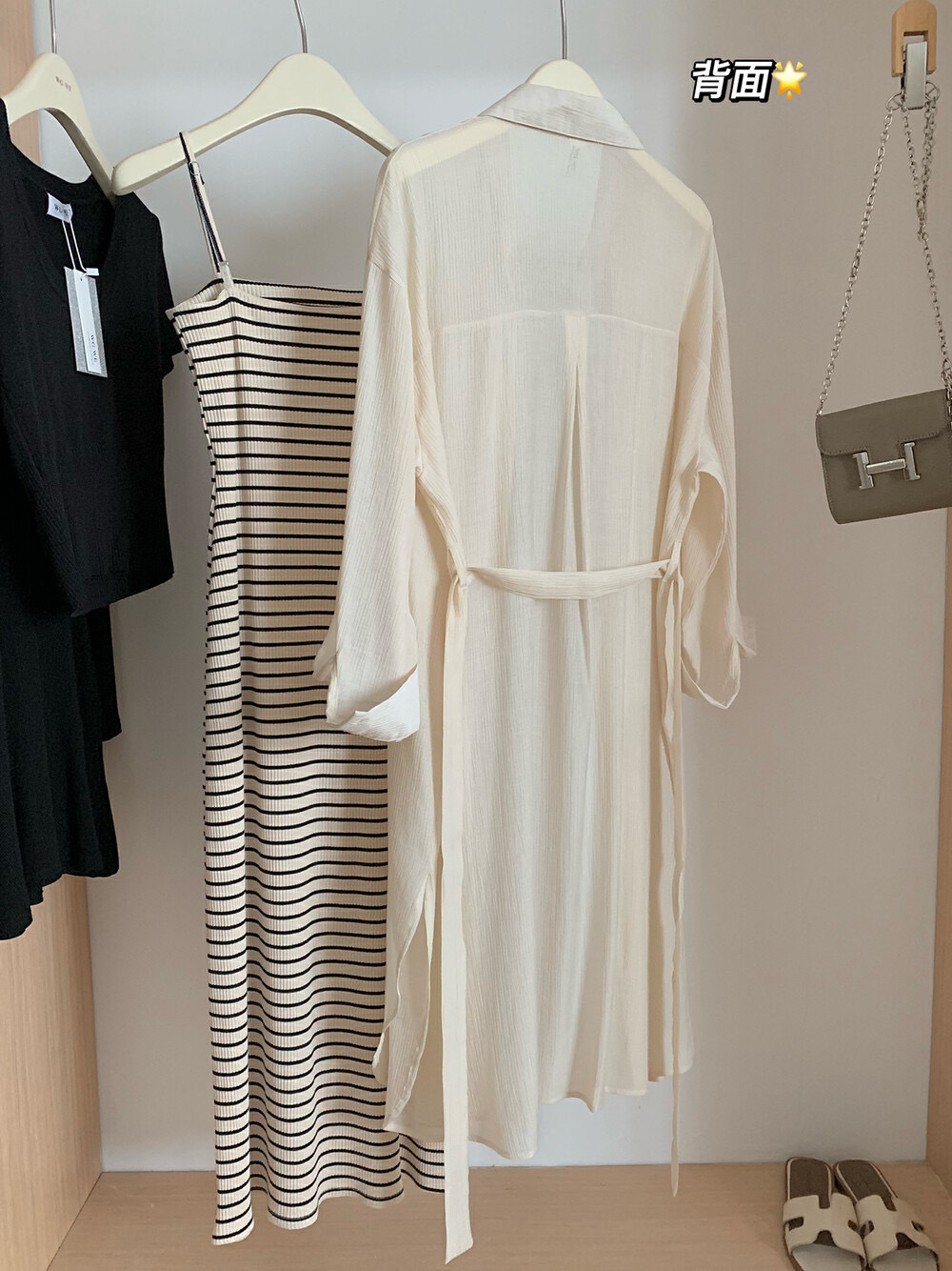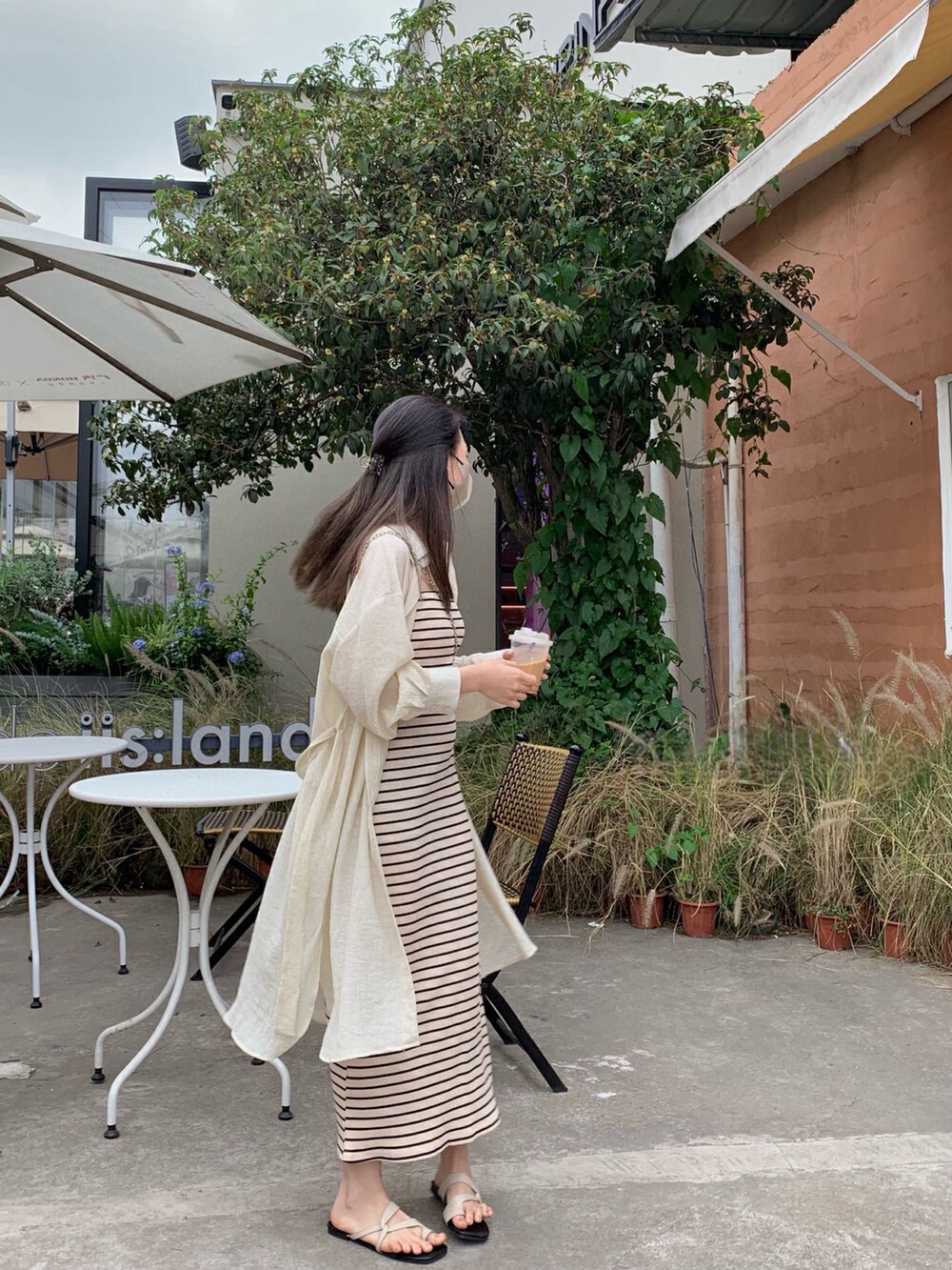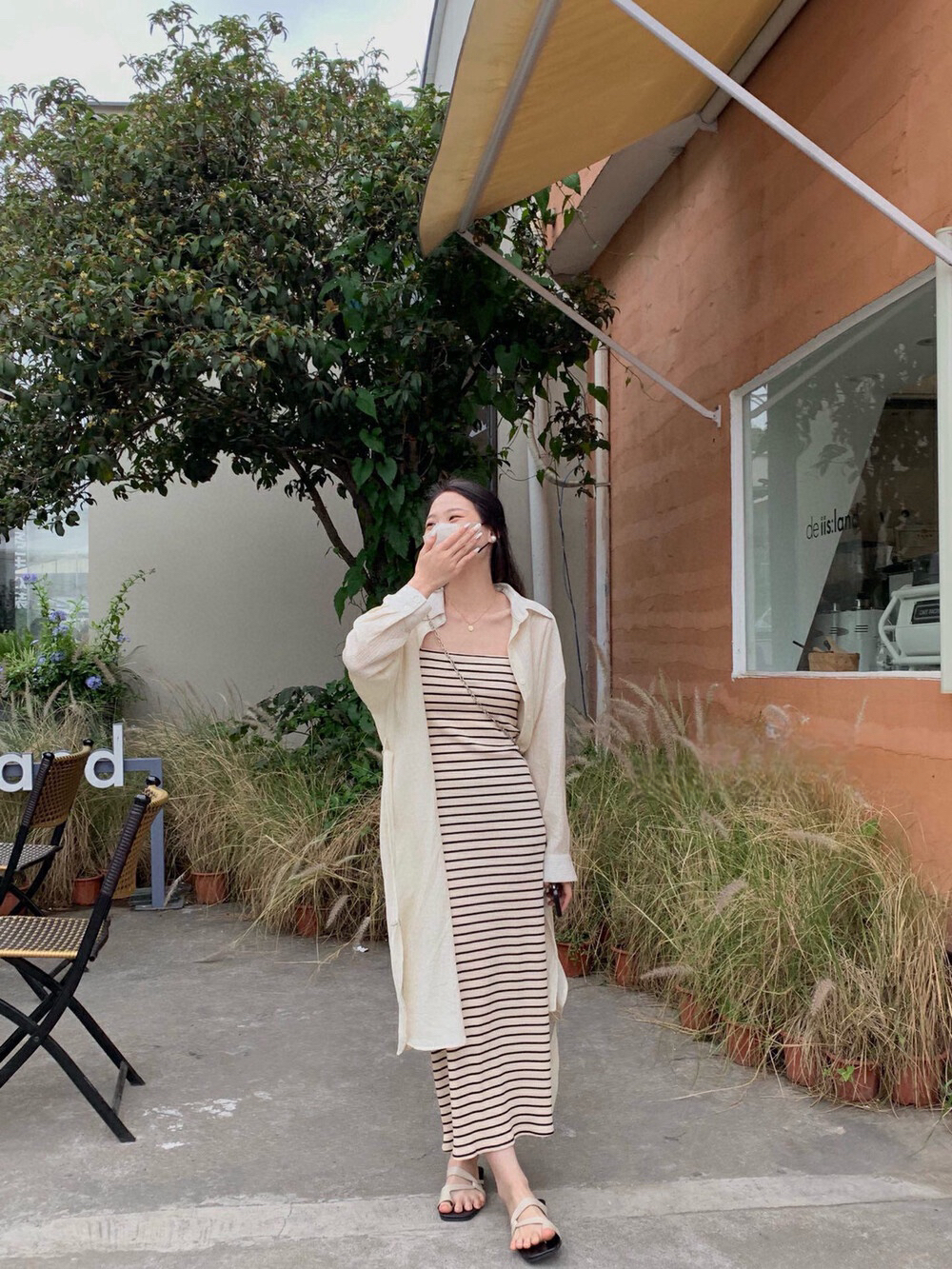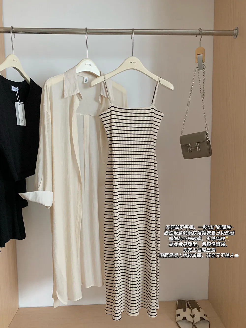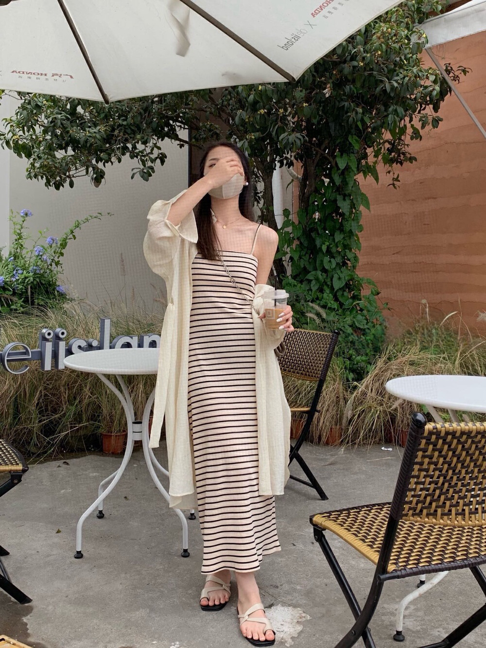 气质条纹裙显瘦百搭一字肩休闲时髦长连衣裙+防晒衬衫两件套套装