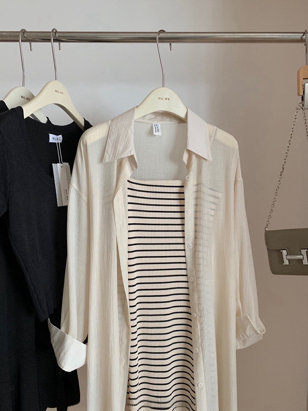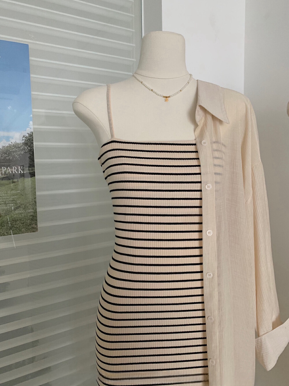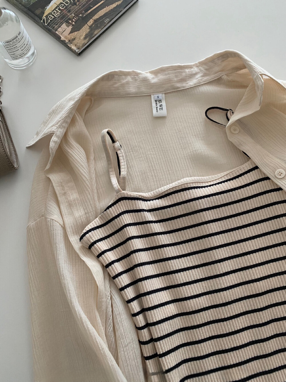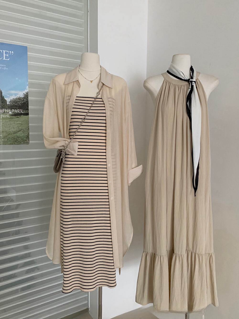 气质条纹裙显瘦百搭一字肩休闲时髦长连衣裙+防晒衬衫两件套套装