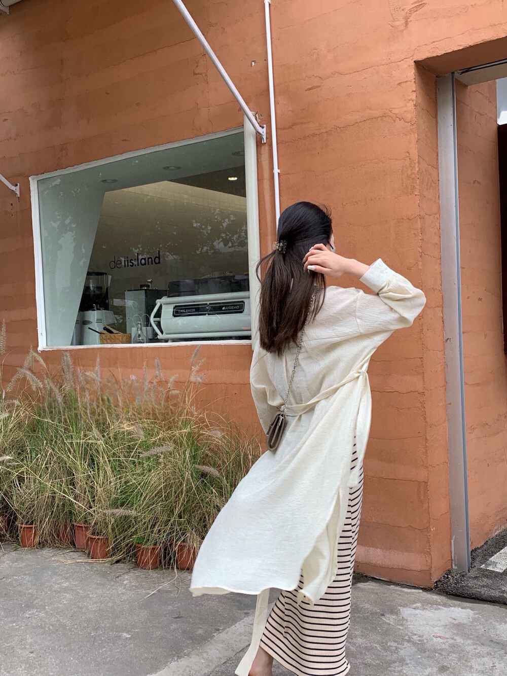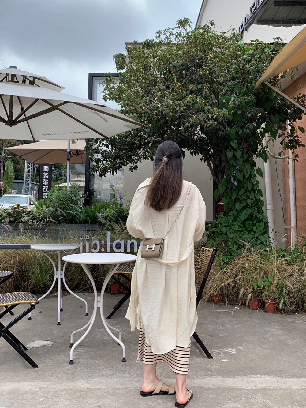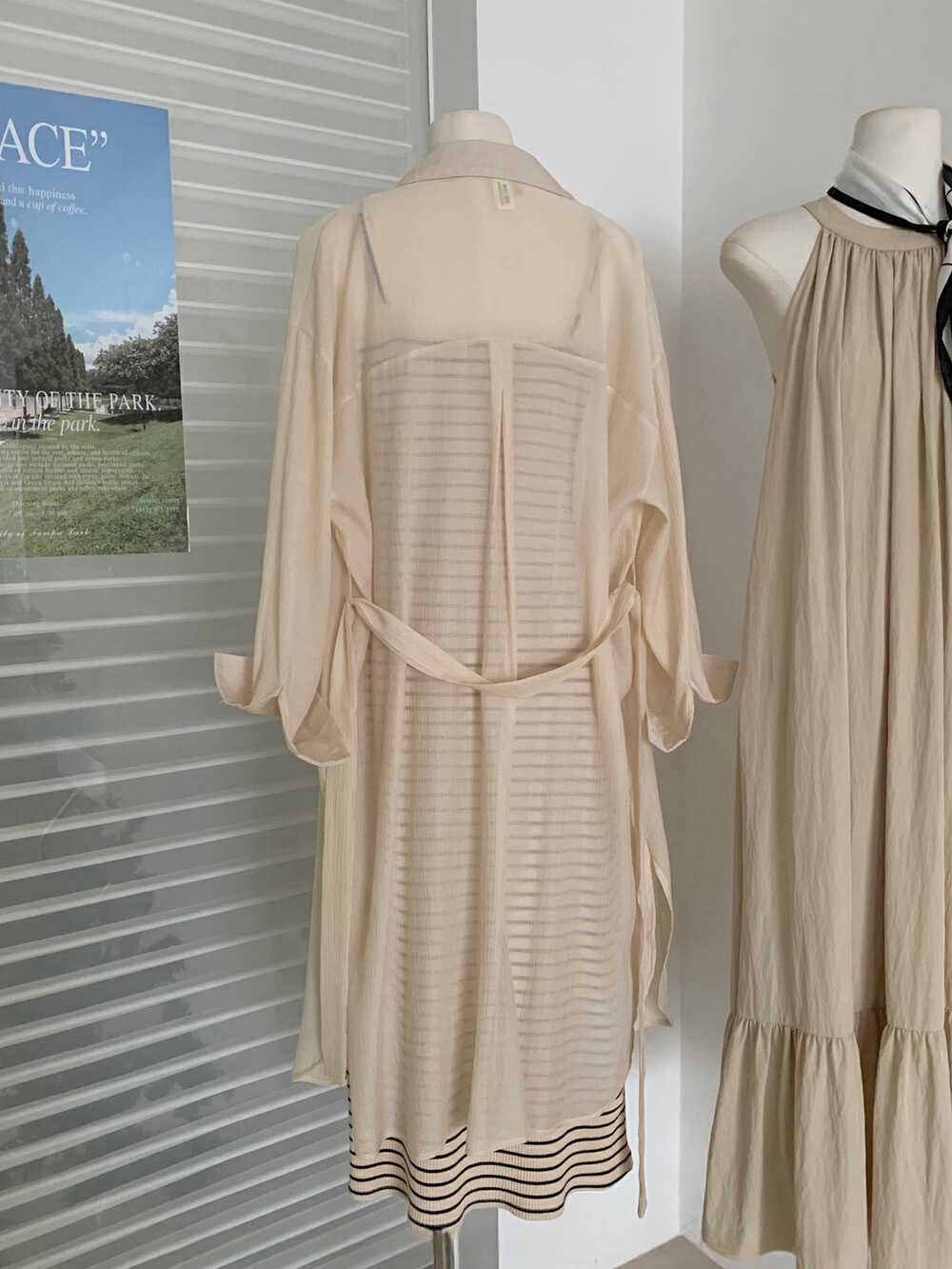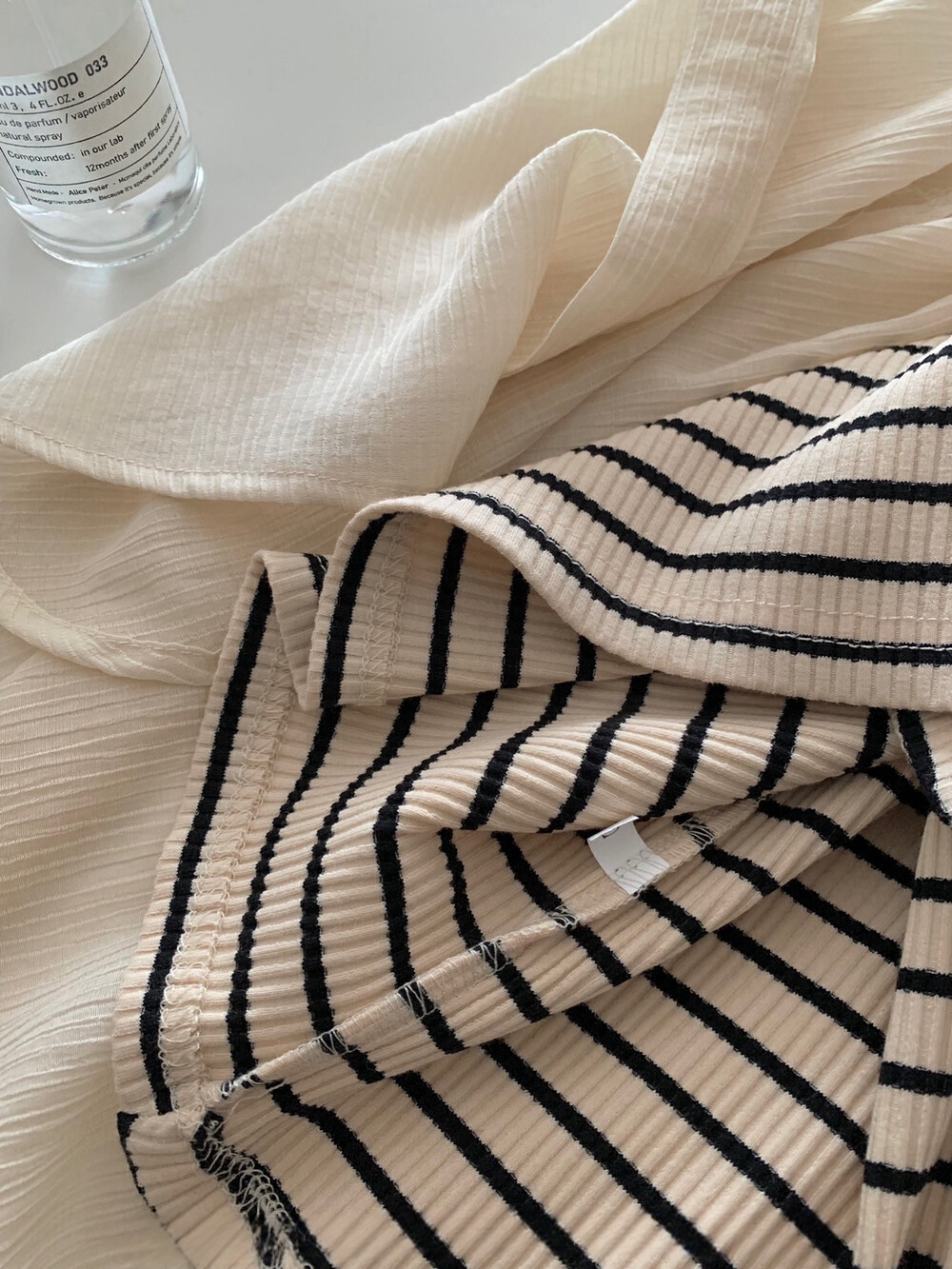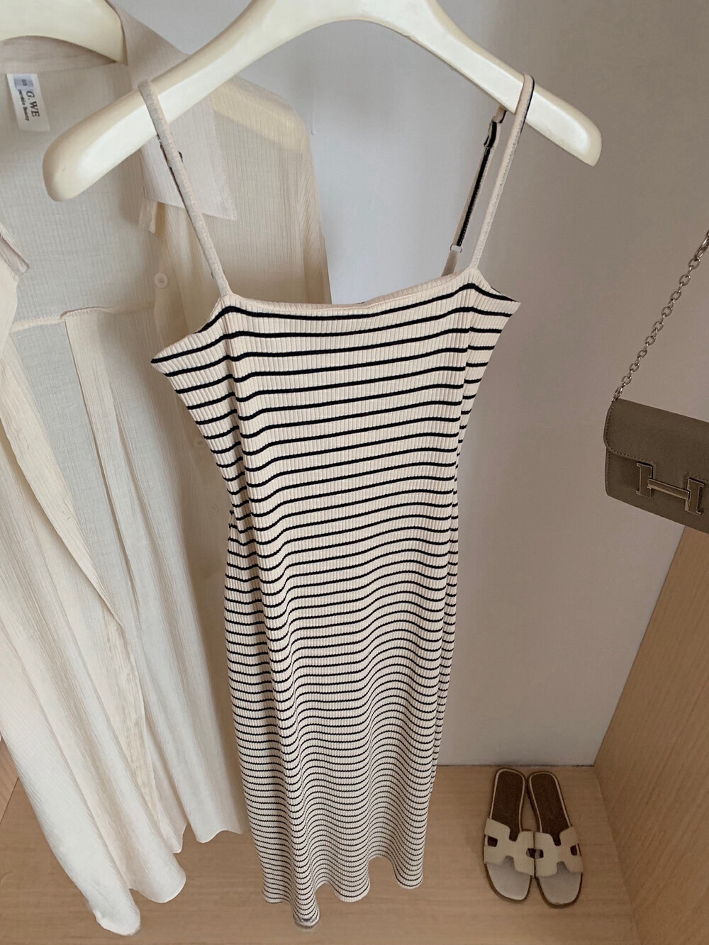 气质条纹裙显瘦百搭一字肩休闲时髦长连衣裙+防晒衬衫两件套套装